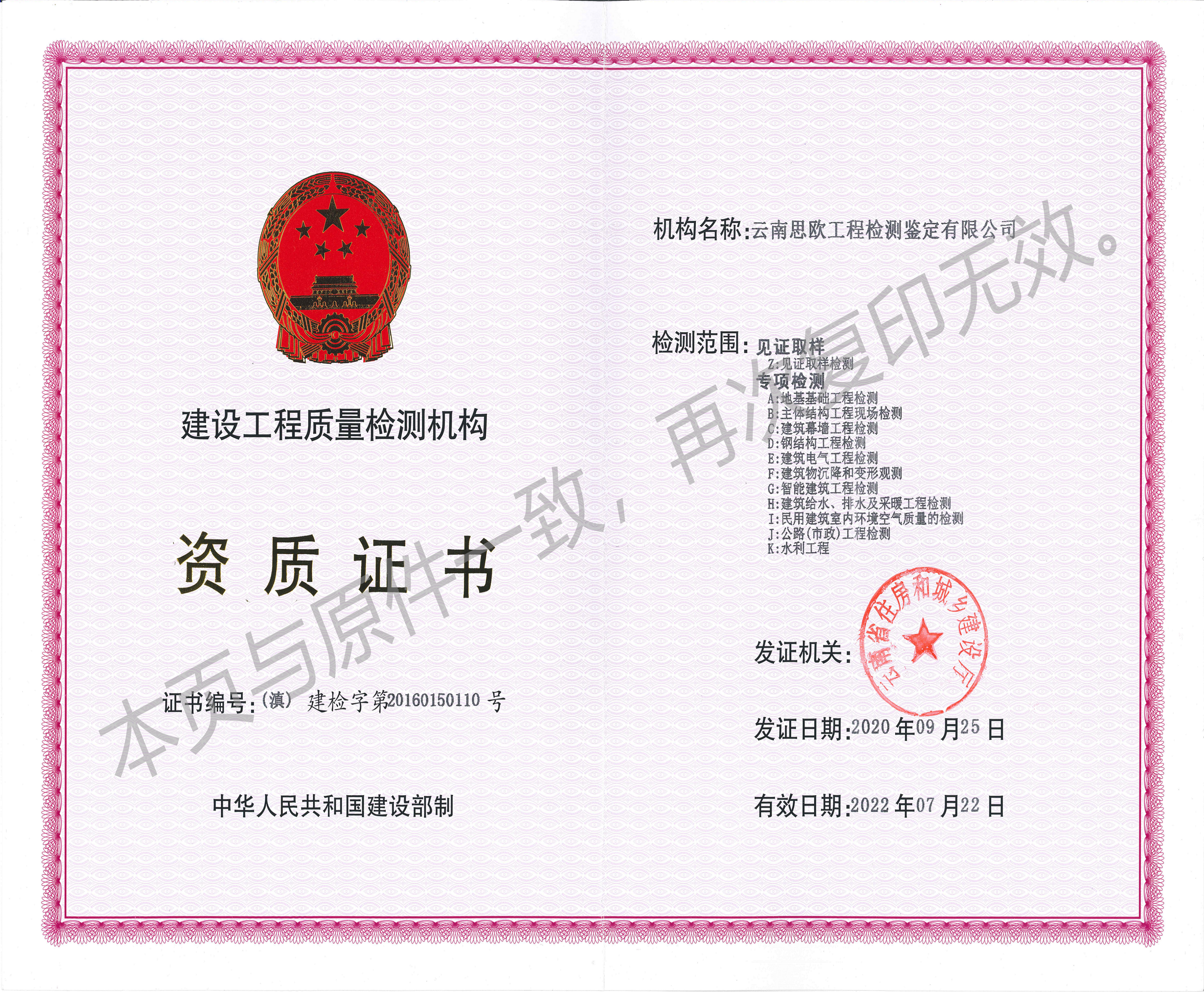 太阳集团tyc4633(股份)有限公司-官方网站扩项云南省住房和城乡建设厅建设工程质量检测机构资质证书顺遂取得。。。。。取证时间于2020年9月25日。。。。。